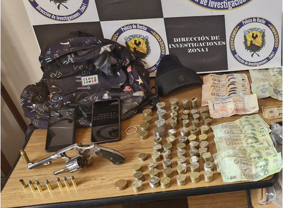 Luego de unos minutos se obtuvo anuencia para el ingreso a la vivienda, donde fueron detenidos dos hombres y una mujer, y se incautó un revólver calibre 32, varios envoltorios con monedas empaquetadas totalizando 2.547 pesos, un vaina detonada, sustancia vegetal, sustancia blanca, así como otros elementos de relevancia para la investigación. En la billetera de uno de los detenidos fueron ubicados 1470 pesos y 10 dólares. En la cocina de la vivienda se encontraba la moto marca Baccio Px que habría sido utilizada en el ilícito, todo lo que fue documentado por personal de Policía Científica.